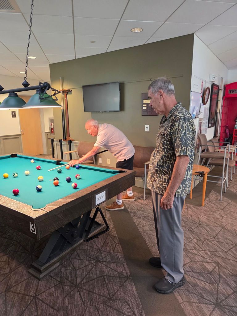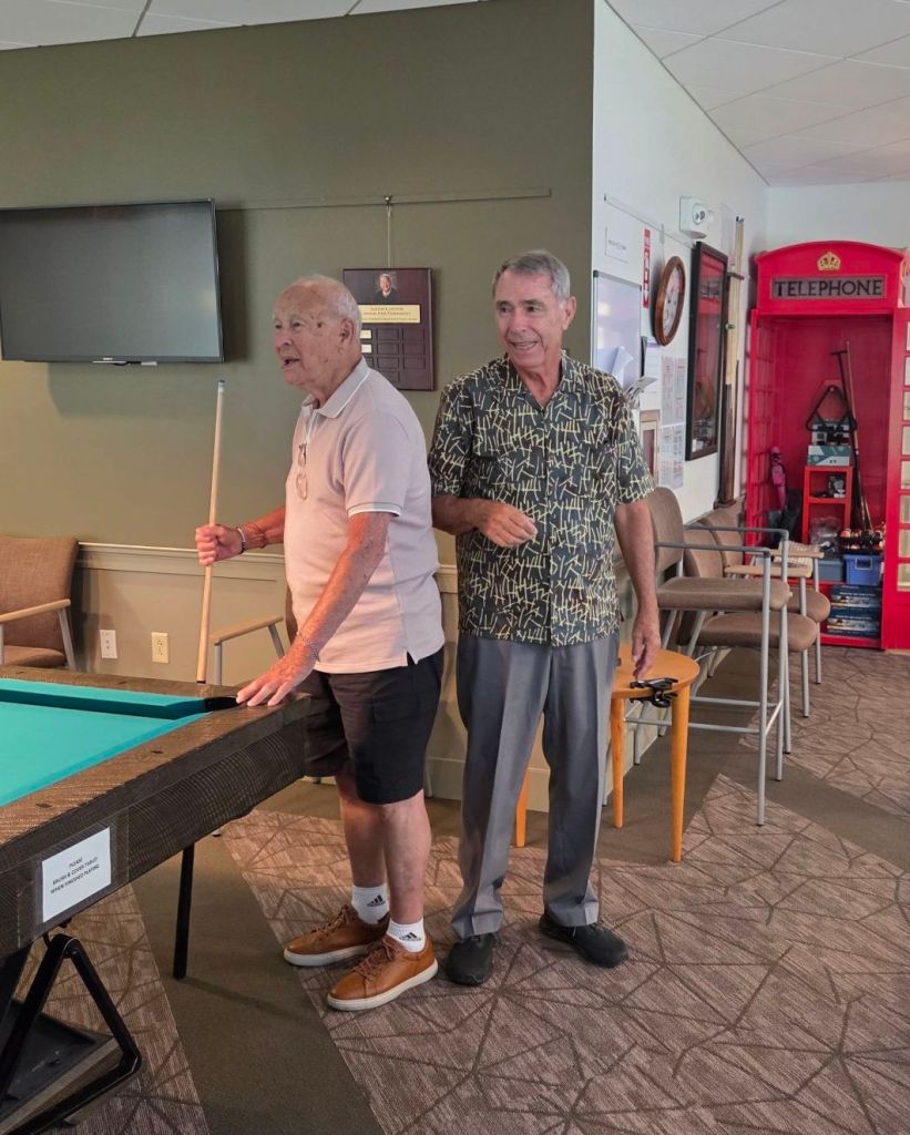 Arthur at left, above, with kids, grands,nieces,nephews and, below, demonstrating his pool technique to Ed. Arthur is manager of the traveling pool team.