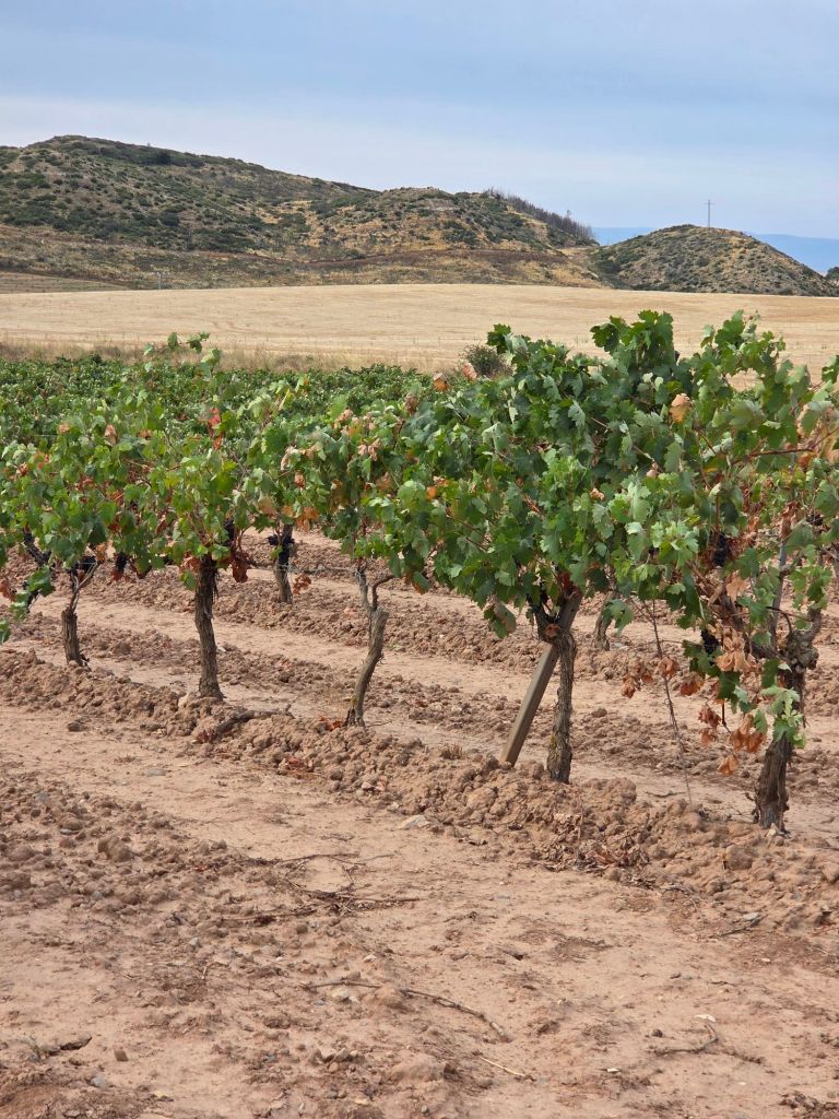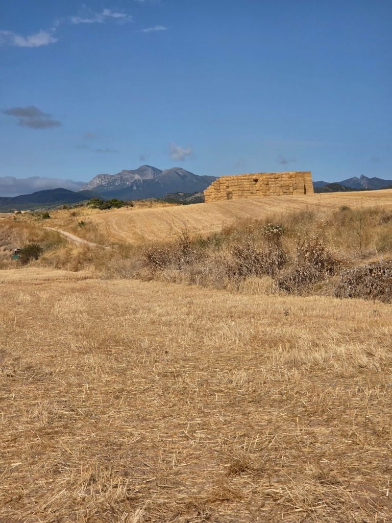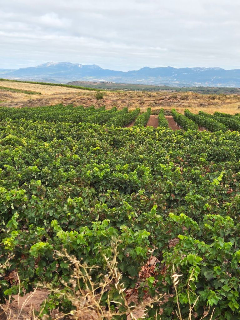 Picos de Europa mountains in the distance. Picnic on the way. Grapes will be harvested soon. Tawny fields and hay.