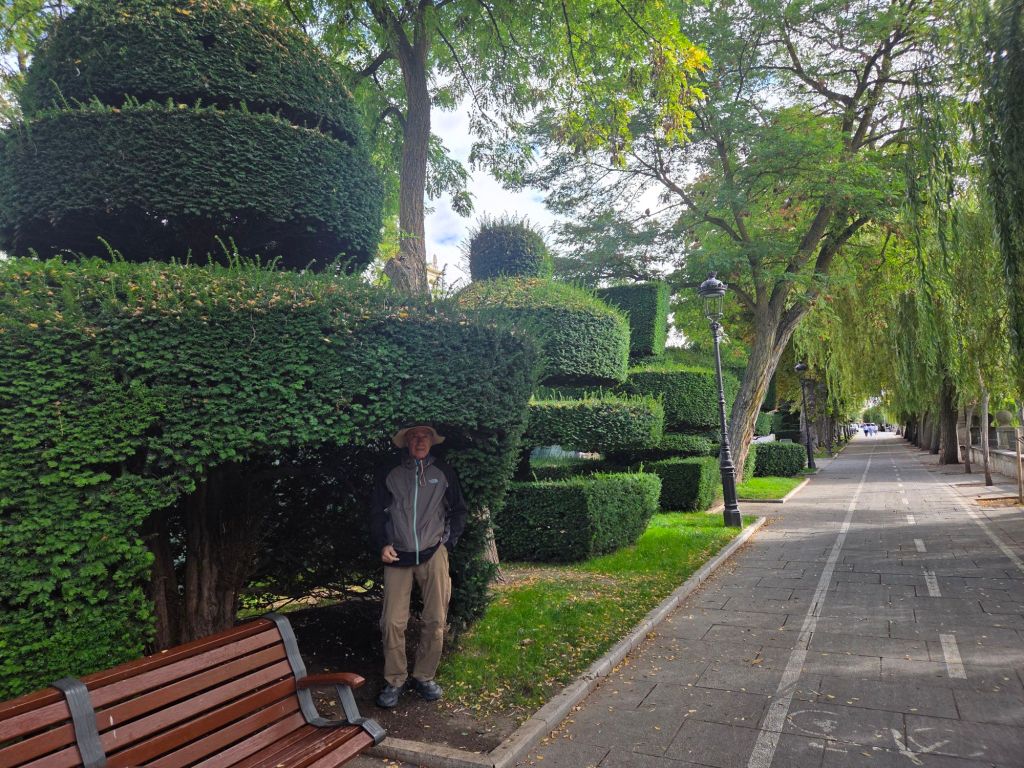 Another view of Ages’ half-timbered architecture, decorated by modern artists.See the animal watching Ed from a second story window. Arriving in Burgos, the gate opens through well preserved city walls. Residents and visitors alike enjoy the city’s spaces.Catedral de Burgos is well restored and maintained. Burgos is the number 5 in Spain, we learn. We made 10:30 am Sunday mass inside in the beautiful Chapel of Saint Tecla.Promenade along the river leads to the Museum of Human Evolution.This museum features important archeological finds from the nearby site of Atapuerca, pushing human life in Europe earlier than previously understood.The view from our hotel room of the beautifully lit Catedral illumined our sleep.