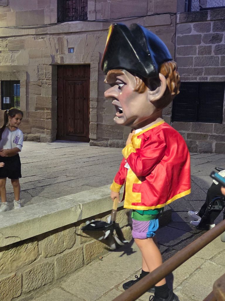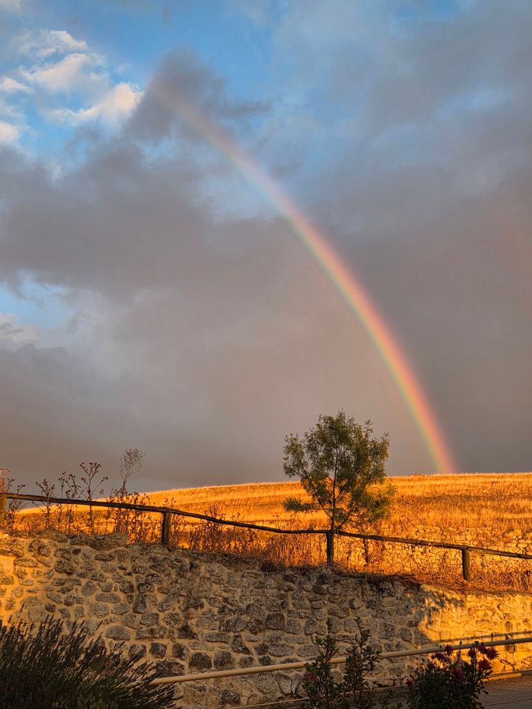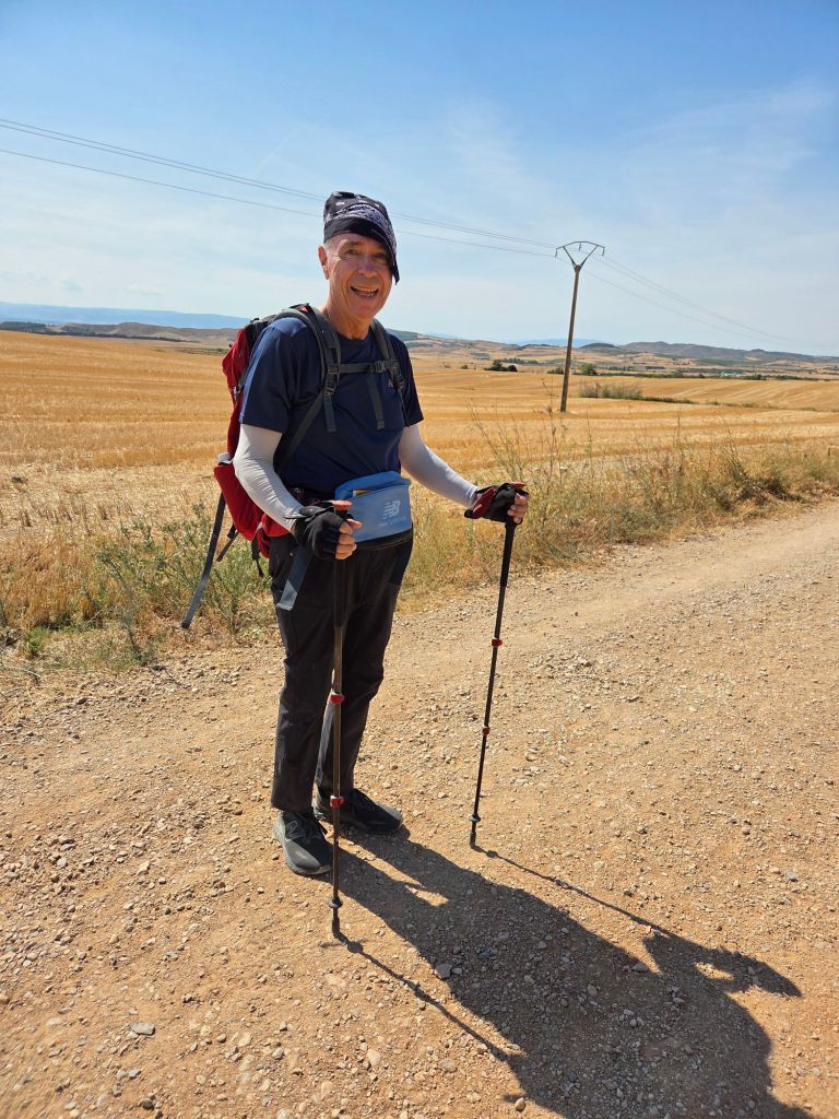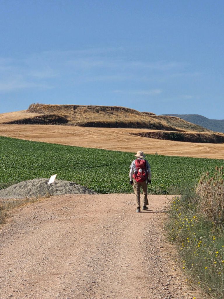 Early on the Camino, Ed misplaced his hat and needed to improvise with a bandana until a replacement hat was acquired in Logrono. The look is good!After driving past us on the Camino, this gentleman was parked in the next tiny hamlet where he and his family have lived for generations. We found him polishing the hood and when we admired his car, he told us that his grandparents bought the car, a SEAT, new in 1967 and passed it on to him.Every town seemed to be celebrating a September festa the night we stopped to sleep. (The brass band would usually stop around 11 pm.) In Logroño, I was unwittingly “whipped” by this mischievous character as I walked by.Ed was much taken by the new hay baling equpment we saw pile the bales into multistory, flat-sided constructions. These have replaced the conical bales we saw on our 2015 Camino.The rhythm of walking the Camino.“He shall put a bow into the sky…”Thanks for accompanying us on the Camino.