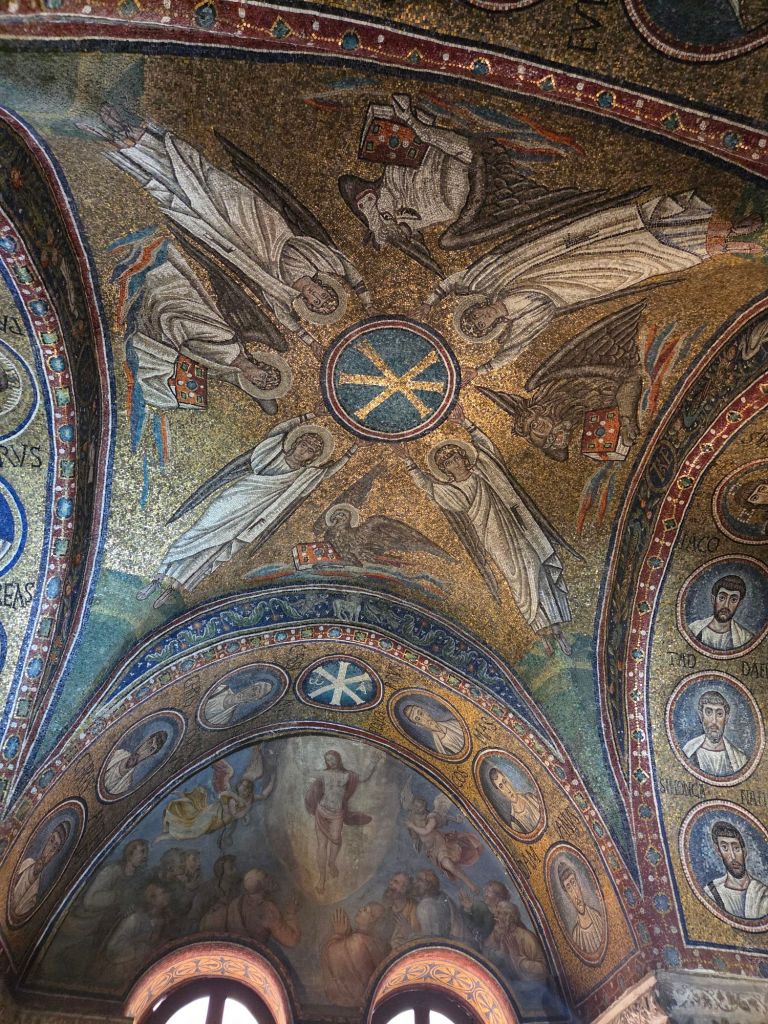 Christ (chi rho in the center medallion) surrounded by the four Evangelists and their symbols. Scattered among the stars are birds signifying resurrection (peacocks) and faithfulness (Egyptian ducks)
