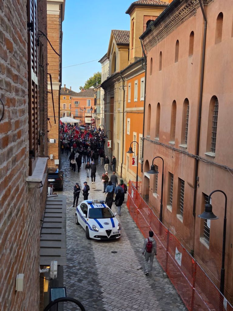 The peaceful courtyard of our B&B which made us feel like Renaissance nobility.View from our window down to the Piazza del Popolo only 100 meters away, filled on Friday morning with protesters for Palestine who had obtained approval of Ravenna city council for a one-day work stoppage to commemorate our visit.
