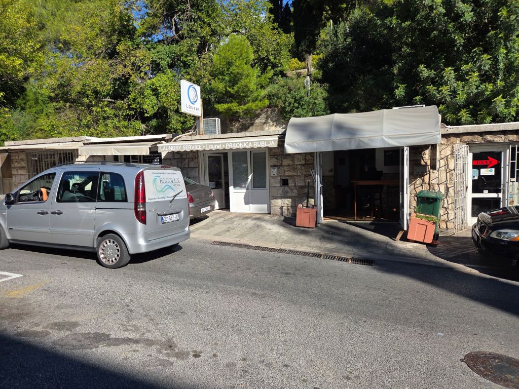 Sunset over the Adriatic upon arrival at Ćilipi Airport on the way down and into DubrovnikNext morning: after misdirection on the internet we were happy to find the laundry, 15 minutes from the hotel, which dealt with a large pile of pent-up demand. Like many other buildings in the “new” part of town, it was a prefab structure. We were off to a good start in Dubrovnik.