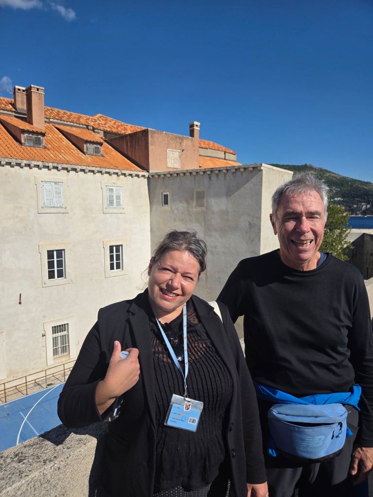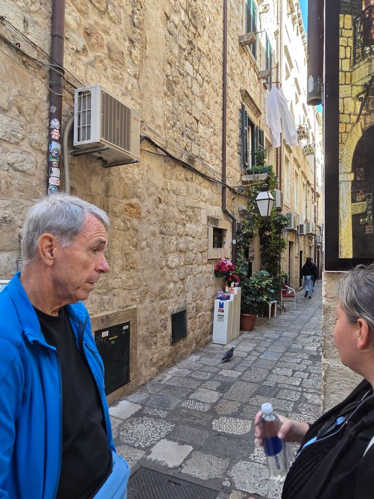 Nina lives on this street with her husband and two children. The older child is now 20 and she is studying in Zagreb to be a doctor, the younger is 14.Adriatic sparkles from Old City walls.Ed shares some of his views with Nina.Looking through an opening in the wall.