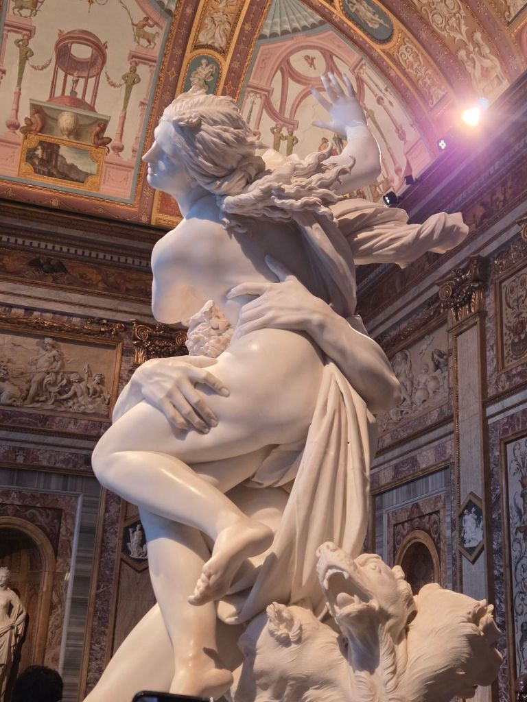 A major Roman highlight was our long-sought visit to the Galleria Borghese, an amazing museum set in a large park within the city. Cardinal Scipione Borghese (1579-1633), nephew of Pope Paul V, was a voracious collecter of ancient Roman art and commissioner of contemporary art from such as Bernini and Carravaggio. It seems that whenever he wanted a piece, he would ask his uncle the Pope to apply pressure so here could get what he wanted.