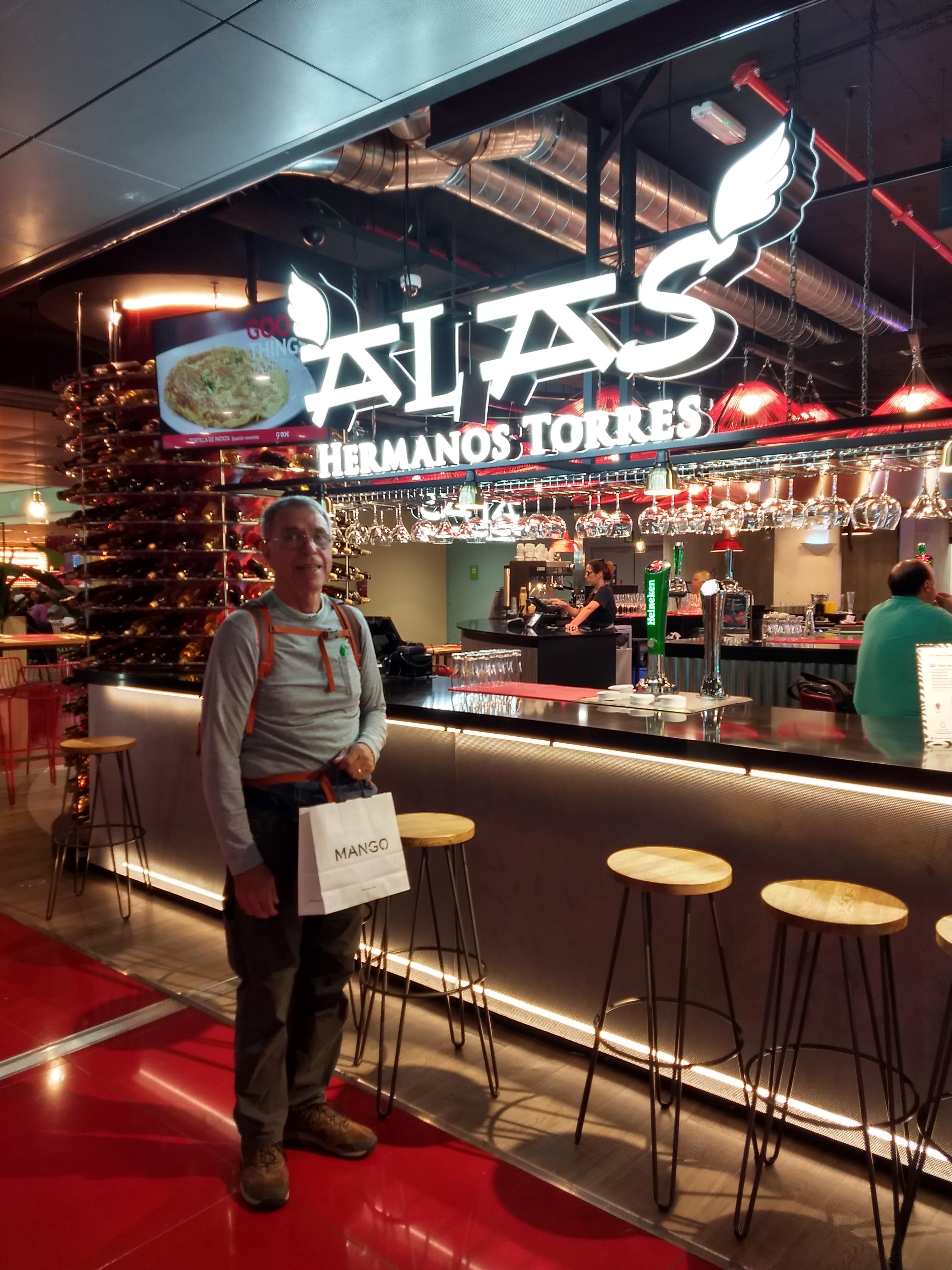 Greetings from Barcelona where it is raining, 51 degrees, and we have a four hour layover until flying onward to Santander to start walking tomorrow. Ed is standing in the photo in front of a sign which I playfully mistranslated as “Tower of Manliness,” holding a shopping bag from Mango Man.