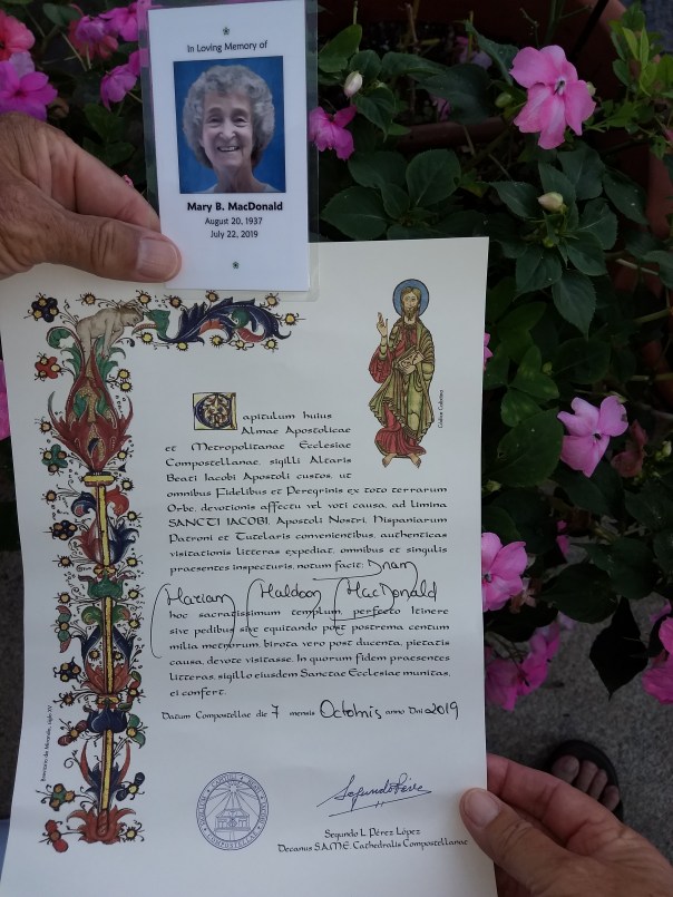 Yes, that is the Cathedral of Santiago de Campostela in the background. We reached the pilgrimage point on Monday, October 7 in a chilly rain, not atypical of Galician weather. This milestone of our journey had its own ups and downs. Up: the laundromat started by a pilgrim-supporter three years ago was still in business and we were able to process a big load. Down: the hotel had erroneously rejected our luggage from the Correos Paq-Mochila baggage forwarding service.Up: a trip to the Central Correos (Post office) reunited us with our bags. Down: when we went to the Pilgrim Office to obtain the credentials certifying completion of the pilgrimage, we were issued numbers 1106 and 1107. The Office was dealing with number 525 at the time (2:45 pm). Only 581 people in the queue ahead of us!Up: at 9:15 pm that night, we received our credentials!Above is the credential, known as a campostella, for Lady Mariam Muldoon MacDonald (Ed’s sister, Mary, in whose memory we walked this Camino). In Latin, the ancient form of words had been used for many of the 1,100 years that pilgrims have been making their way through hills, valleys, mountains, rivers, mud, dust and other perils to the resting place of Saint James the Apostle.Perhaps those 1,100 years of pilgrims is the reason our queue numbers were 1,106 and 1,107. The high numbers also mean that the daily total was higher than 1,100. In the city, there were more pilgrims than we expected to see in October. Indeed, when the 2019 numbers are compiled, we may find that recent annual counts of 250,000 on all the various routes of the Camino are exceeded this year.