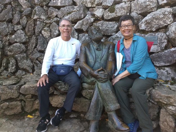 Ed and Anne sit with Maestro Gaudi on a bench